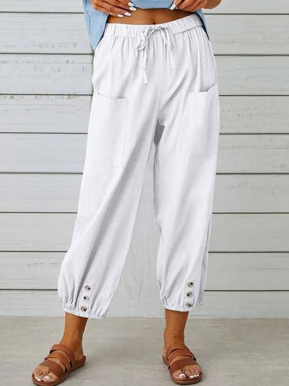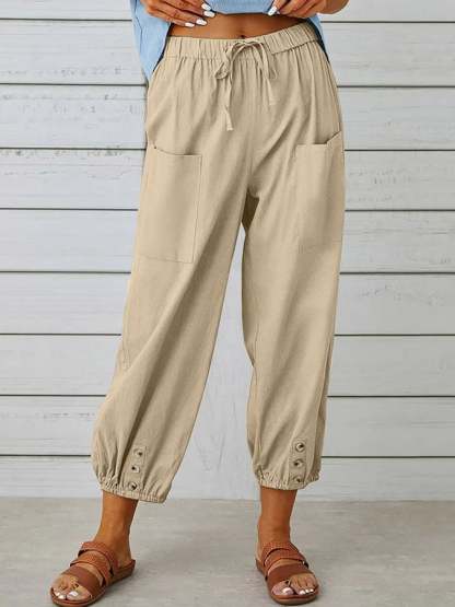Solid Color Casual With Pocket Buttons Cotton Linen Trousers