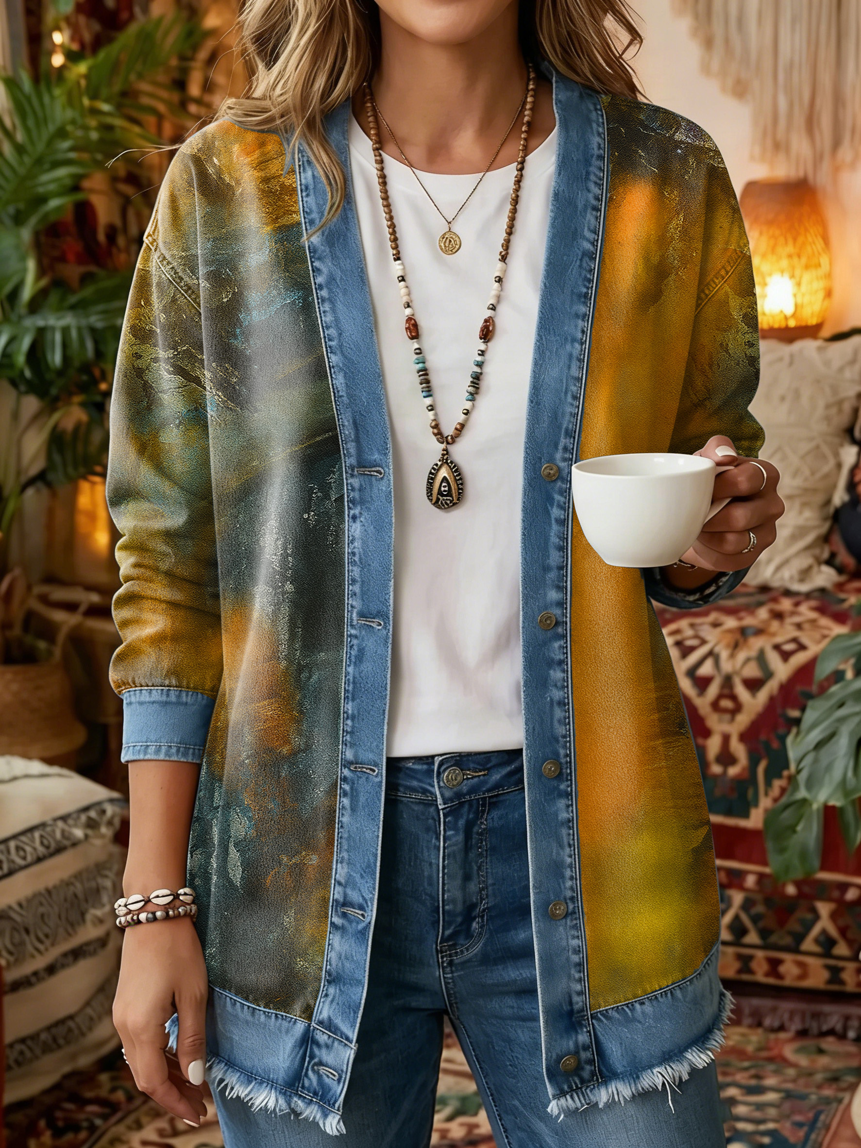 Clearance Sale 🔥 Women's Vintage Waffle Knit and Denim Patchwork Hooded Cardigan